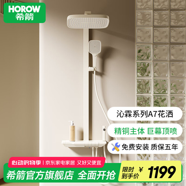 HOROW 希箭 易洁软胶大顶喷增压四功能淋浴花洒A7 奶白色冷热数显氛围灯方管