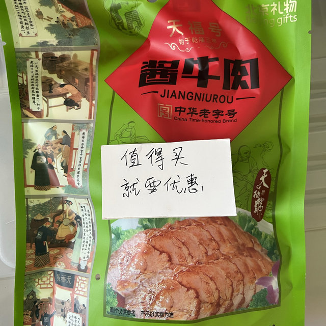 包装:塑料➕真空包装内容:酱牛肉这款酱牛肉是老字号的,过节的时候经常会吃到。而且口味多年来一直没变,拆袋直接吃口感有嚼劲,越吃越香。加热吃会比冷吃咸一些,但牛肉...
