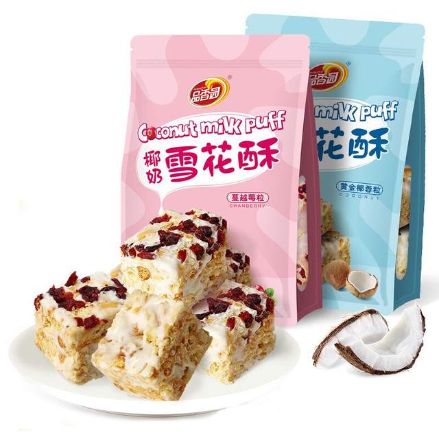 品香园(PinXiangYuan)这款蔓越莓口味椰奶雪花酥,配料选用黄油、鸡蛋、椰子粉等营养物质。糕点松软香酥且表面具蔓越莓颗粒,口感酸甜,不易粘牙。独立小袋包...