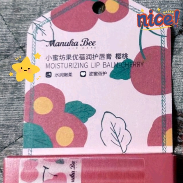 [小蜜坊果优蓓润唇膏]我买的是樱桃味的,已经用了很久了才来评,打开没有香精味,很好闻,膏体是白色的,涂上呈透明,很润推荐购买