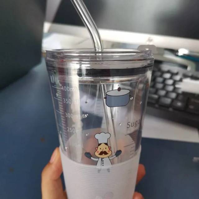杯子400ml容量很合适,不大不小!透亮的玻璃杯配上花纹很是好看!密封得不错,吸管处可以用胶塞封住,送了一个洗吸管的小刷子,挺好玩的杯子!
