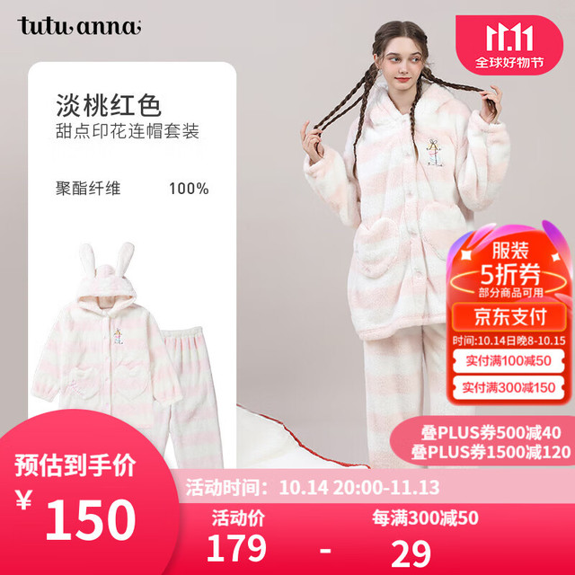 tutuanna 趣趣安娜 秋冬珊瑚绒睡衣女 公主风羊羔绒印花连帽连帽家居服套装