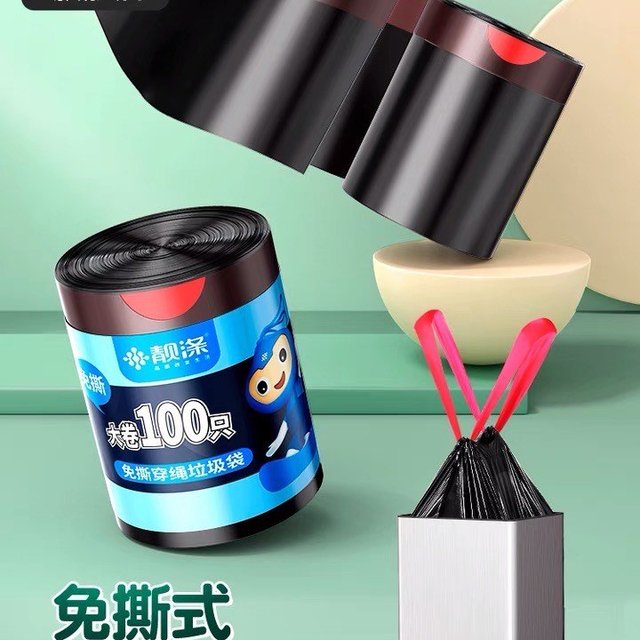 靓涤免撕抽绳式垃圾袋家用加厚实惠装手提式厨房圾圾塑料袋中号,穿绳收口,一提即可!生活就是要简单,免撕抽取式设计!