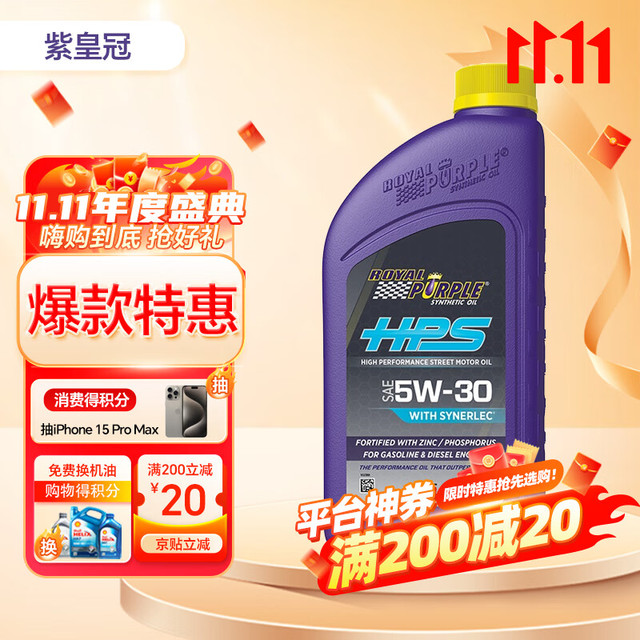 PLUS会员:ROYAL PURPLE 紫皇冠 5W-30 SL级 HPS 全合成机油 946ml49.4元(需买4件,共197.6元,需用券)