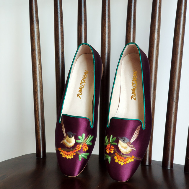 ZUMUSHOW 祖母秀堂 【山雀】真丝手绣乐福鞋(深紫色)36码