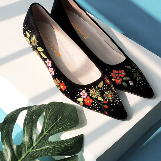 ZUMU'SHOW 祖母秀堂 莫奈花园丝绒猫跟鞋(曜石黑)37码