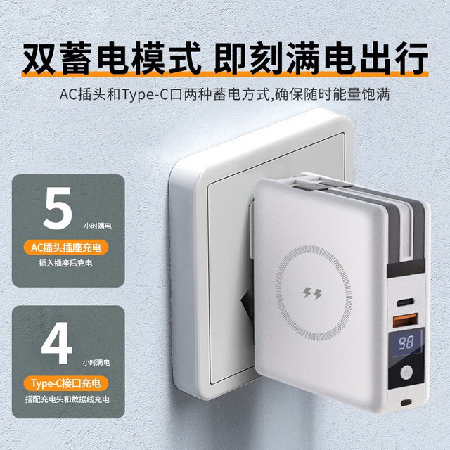 NuBra 充电宝自带线自带插头超级快充20000mAh移动电源 磁吸无线充电大容量苹果适用华为小米三星 白色138.81元(需买2件,共277.62元)