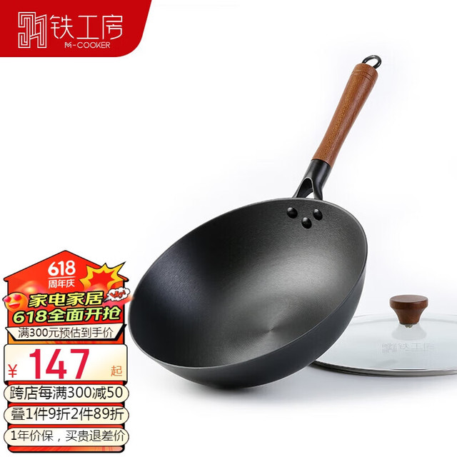 M-COOKER 铁工房 LMIX 无 铁工房平底炒锅窒氮化铁锅不易粘锅炒菜锅电磁炉炒锅厨具28cm带盖年轮款124.67元(需买3件,共374.01元)