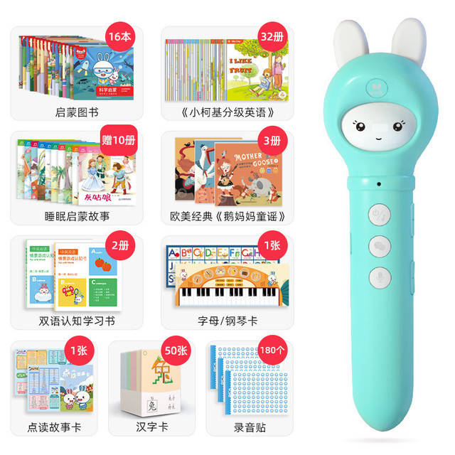 这个火火兔非常的有趣,功能也很多,点书不只是书上的文字会识别,图画也会识别,很好玩,可以唱歌儿,听故事,学英语,国学经典都可以。出门带支笔也很方便随时随地可以听...