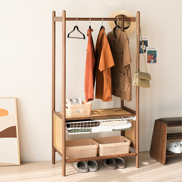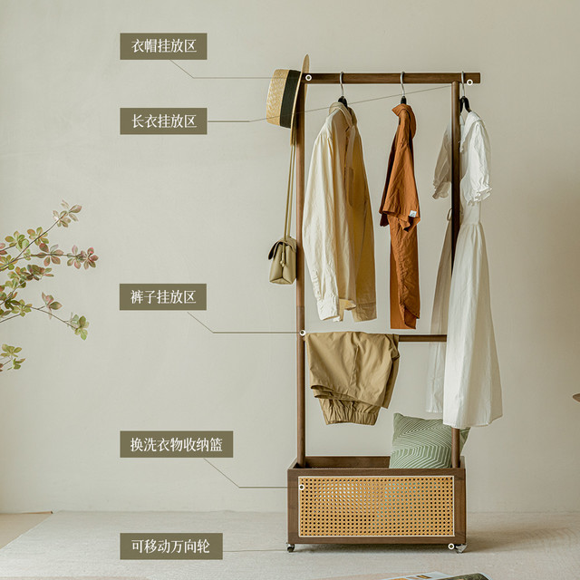 无意黑胡桃实木挂衣架落地卧室可移动脏衣篓衣架室内多功能衣帽架