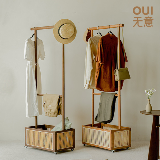 无意 黑胡桃实木挂衣架落地卧室可移动脏衣篓衣架室内多功能衣帽架