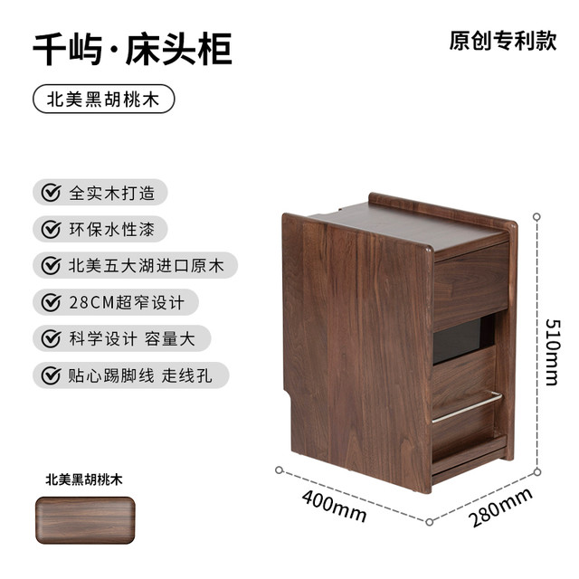 无意 千屿床头柜 28cm超窄 黑胡桃木