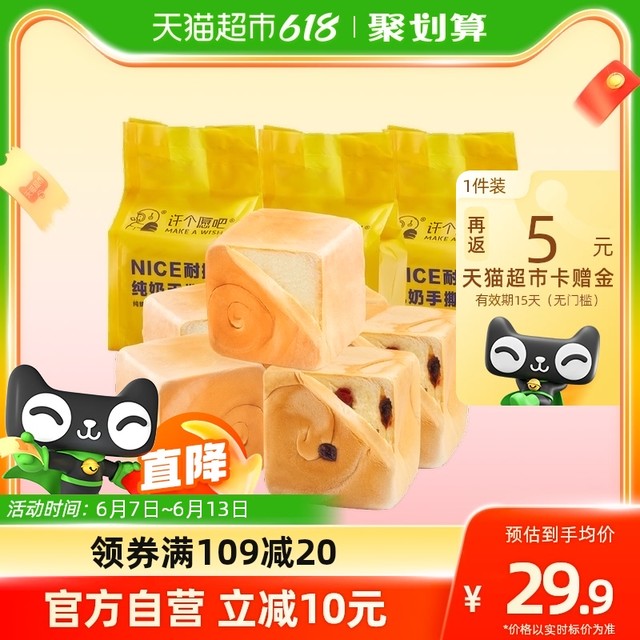 MAKE A WISH 许个愿吧 纯奶手撕面包全麦吐司整箱学生营养早餐代餐零食200g*6袋13.9元(需用券)