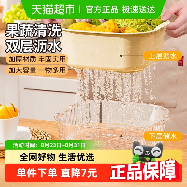 我购买的是妙然双层沥水篮大号滤果蔬盘厨房洗菜盆塑料淘米筐菜篮子单个果篮。我是天猫超市购买的,差不多是为了凑单,原价10.9,折后价为9.27元,加上我的88V...
