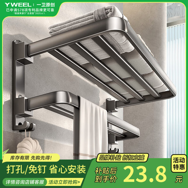 一卫 YWEEL 毛巾架免打孔浴巾架可折叠卫生间浴室厕所置物架壁挂式太空铝收纳 枪灰-双折叠60cm