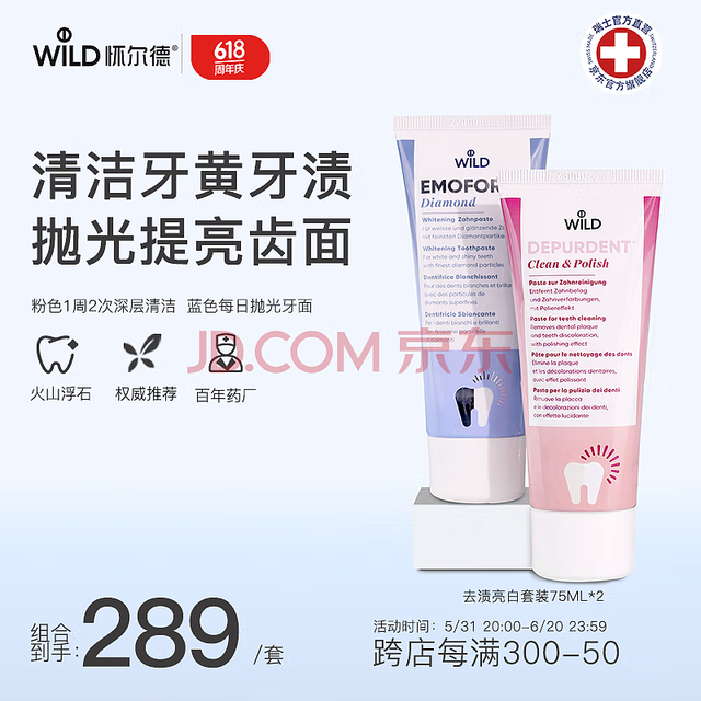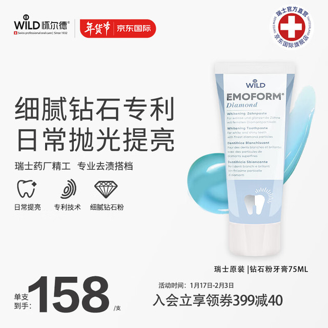 【爆款必抢】怀尔德dr wild瑞士进口钻石粉牙膏去牙渍牙黄亮白护龈含氟emoform75ml【京东价】229元【到手价】157.9元【活动时间】6.6-6.8... 阅读全文