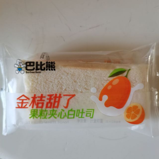 巴比熊金桔味白吐司面包,120g共4包,独立包装的,还是可以的,中间是有桔子,可以小饿来一包,活动补贴1元买的,还是挺直的,