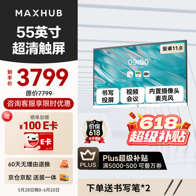 视臻科技 新锐55英寸 会议平板一体机 会议显示器 投影会议一体机商用显示器 电子白板黑板教学会议 触控大屏 壁挂版2911.14元(需用券)