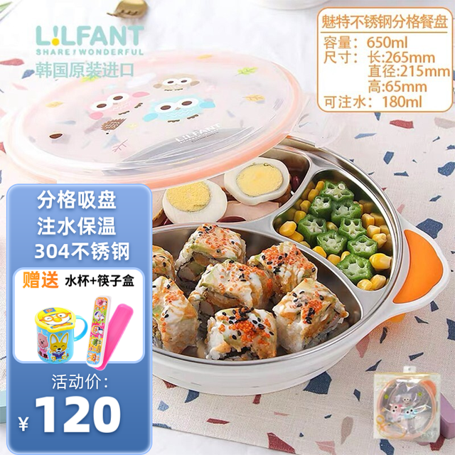 Lilfant 利房 儿童餐盘分格保温饭盒不锈钢韩国餐具宝宝婴幼儿吸盘式家用