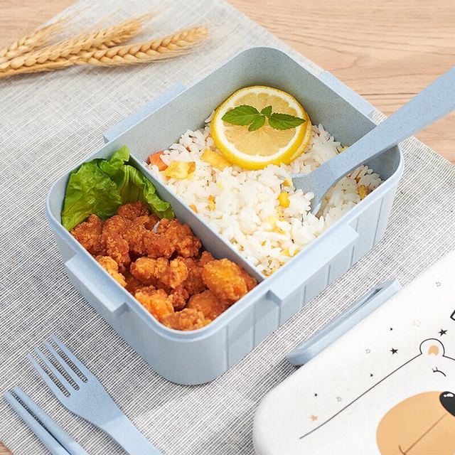 沤迈宝 小麦秸秆韩式饭盒套装分格便当盒小学生带盖餐盒微波炉卡通 大号蓝色