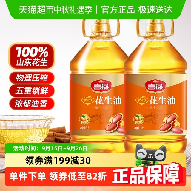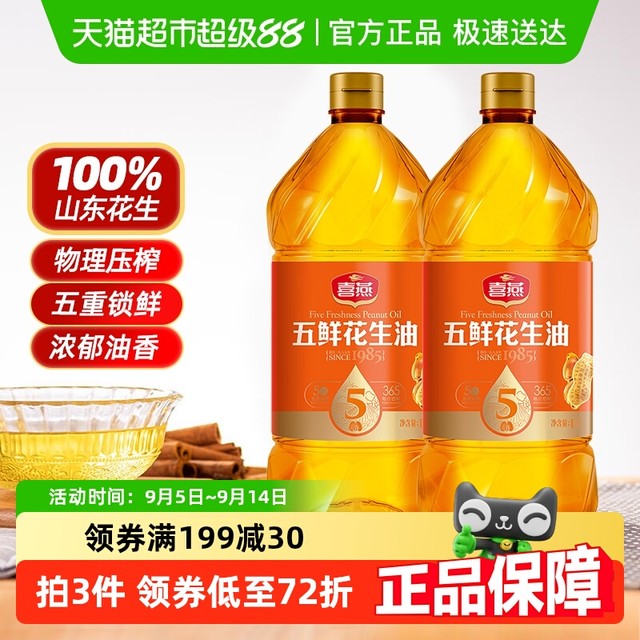 35.9 喜燕 happy swallow 五鲜特香花生油物理压榨一级食用油1Lx2瓶烘焙油山东纯正粮油42.3元(需买2件,共84.6元)