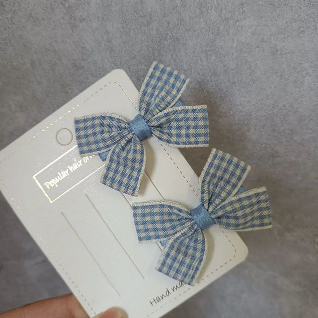 杰西 韩式甜美可爱少女儿童学生发夹浅蓝色格子小蝴蝶结对夹边夹刘海夹