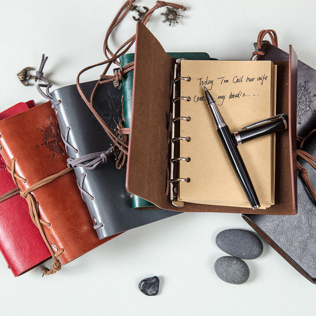 欧式复古海盗记事本创意旅行日记本笔记本子文具活页夹定制logo牛皮纸素描空白手绘简约活页本可拆卸手帐本(A6儒雅黑)