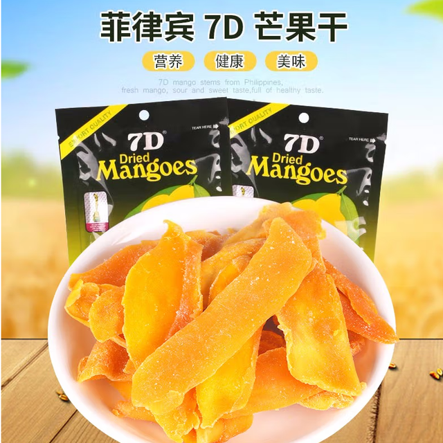 可喜欢吃芒果干了,就这个7d牌子的一直回购芒果干肉比较厚实但不硬,口感糯叽叽的酸酸甜甜的特别好吃!价格搞活动十几块一包吧就贪嘴会全部吃光容易上火