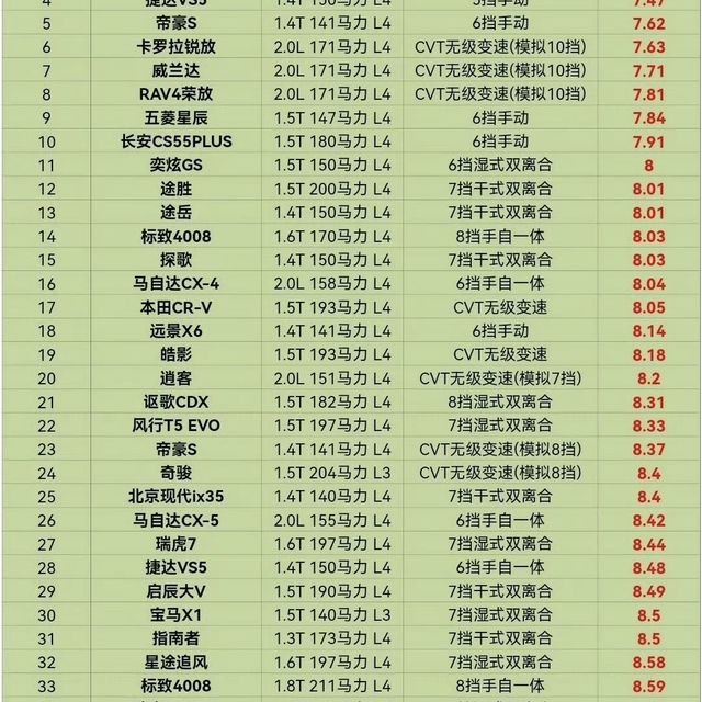 紧凑型SUV油耗排行榜,你的车上榜了吗?