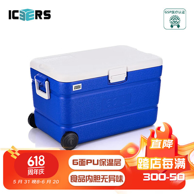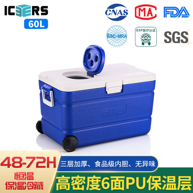 ICERS 艾森斯(icers)60L高品质PU保温箱 医药品冷链箱 生物安全转运箱 生鲜配送冷链62L 有轮无取物口蓝色PU6面发泡 有背带温度显示