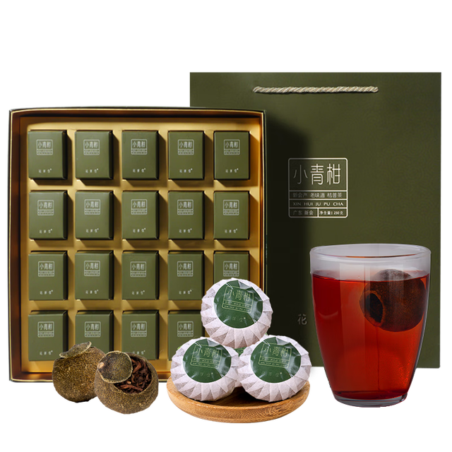 花伴饮 新会小青柑精选新会青柑,上好的小青柑应该是油包密集且圆润轻闻有浓郁得让人无法抗拒的香柑气。精美礼盒包装。一粒一泡,二十六泡仍不失水,口感顺滑,果香浓郁,...