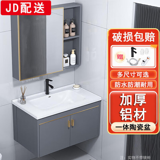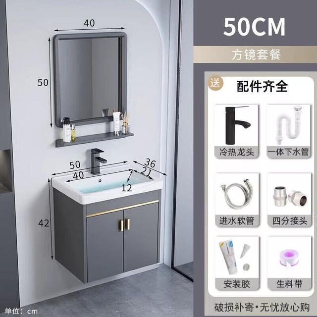 时光旧巷小户型太空铝浴室柜卫生间一体陶瓷洗脸盆柜组合洗手盆家用洗漱台 50*35cm吊柜全套+方镜