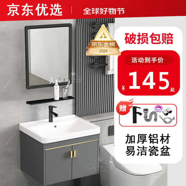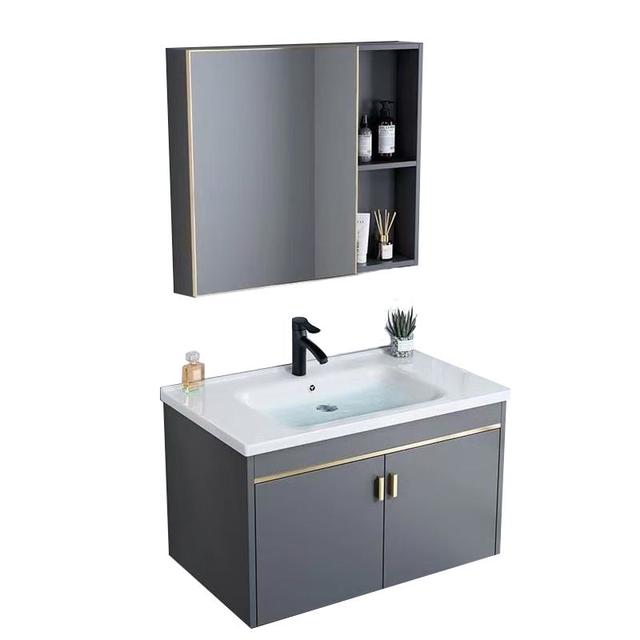 时光旧巷 小户型太空铝浴室柜卫生间一体陶瓷洗脸盆柜组合洗手盆家用洗漱台 50*35cm吊柜龙头(无镜图二款)
