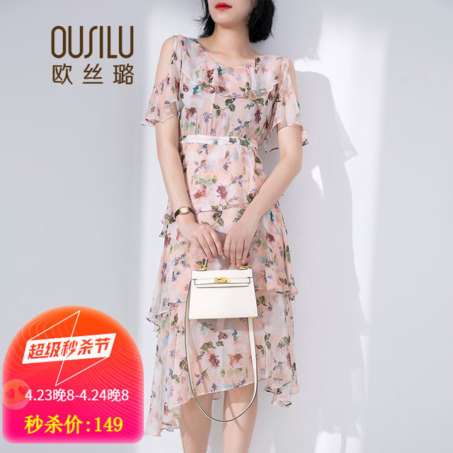 OUSILU 欧丝璐 夏季新品桑蚕丝碎花印花短袖连衣裙70OSL211904 粉色 M