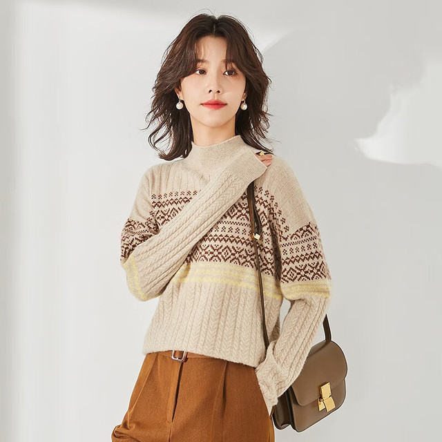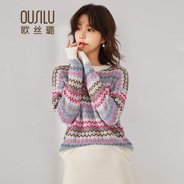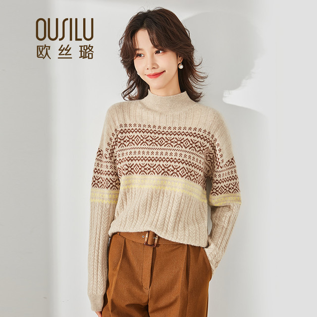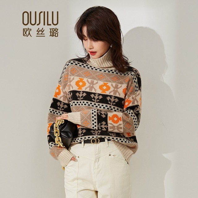 OUSILU 欧丝璐 女士高领提花撞色加厚纯羊绒衫