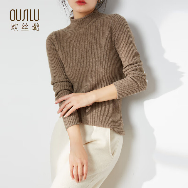 OUSILU 欧丝璐 纯色简约打底纯羊绒衫女11OSL213013 咖色 100/M