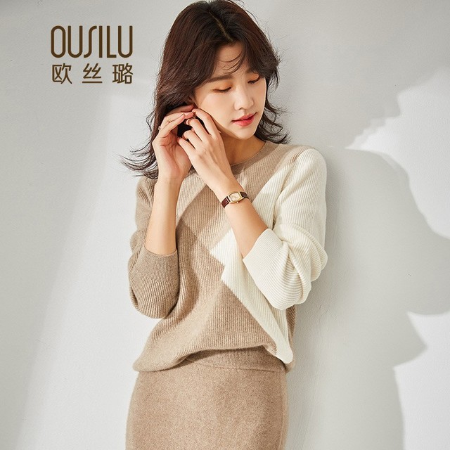 OUSILU 欧丝璐 圆领撞色纯羊绒衫女10OSL203163 棕咖 95