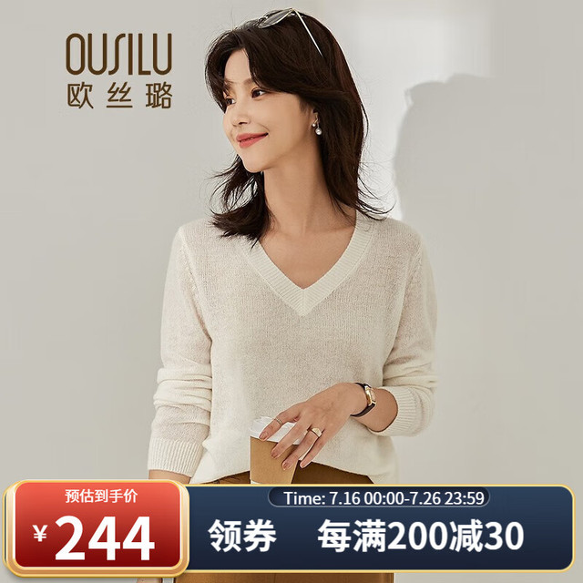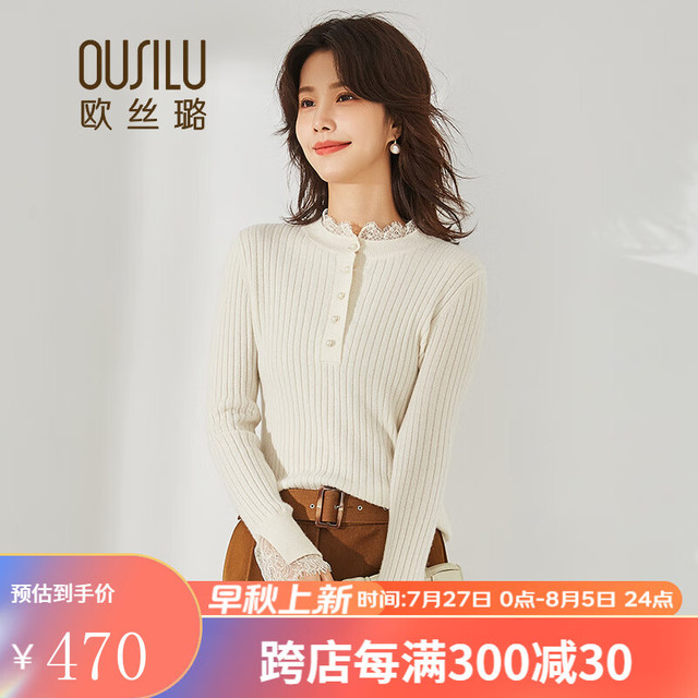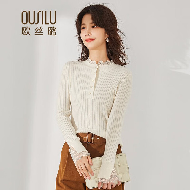 OUSILU 欧丝璐 秋冬新品甜美蕾丝拼接纯羊绒衫女11OSL213053 奶白 105/L