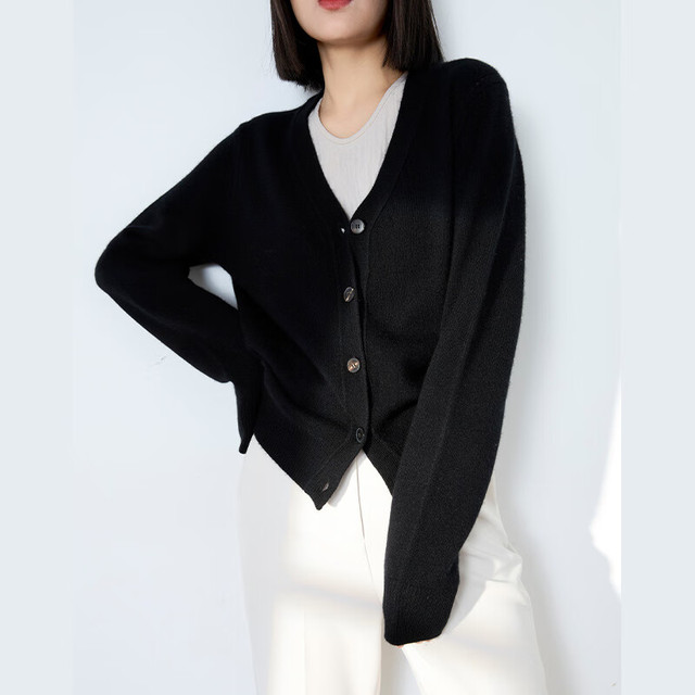 OUSILU 欧丝璐 纯色百搭V领女开衫纯羊绒衫毛衣13OSL233057 黑色 XL