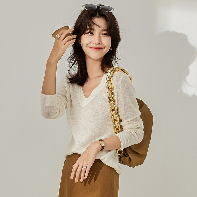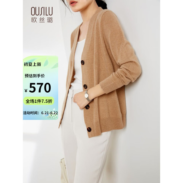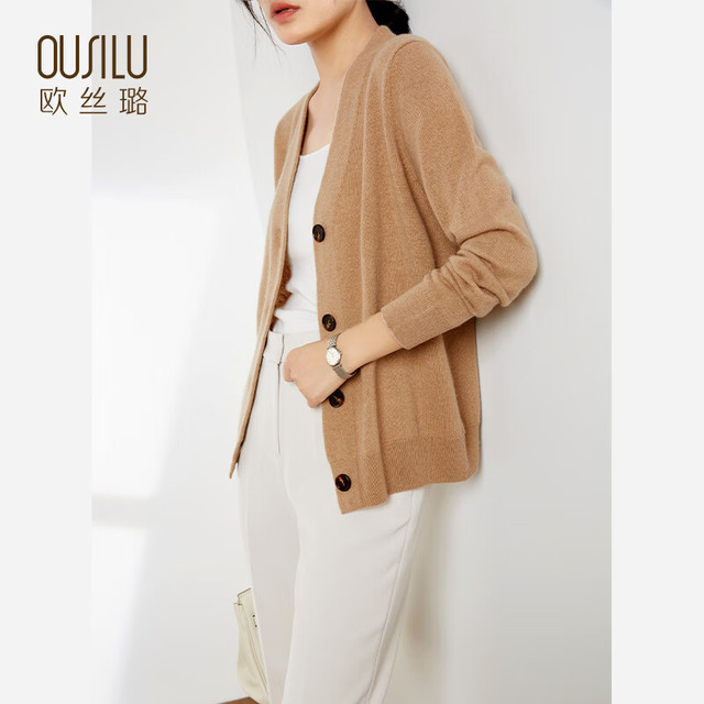 OUSILU 欧丝璐 秋冬新款纯色V领简约百搭纯羊绒开衫女12OSL223051 黄棕 100/M