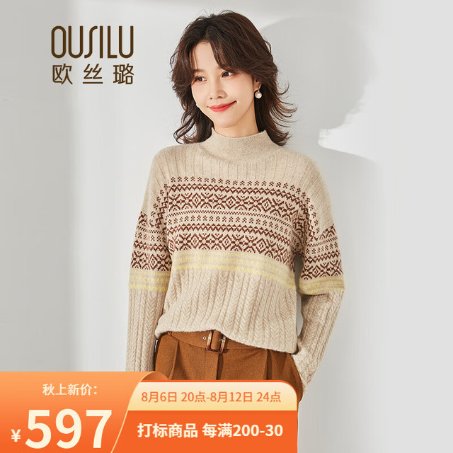 OUSILU 欧丝璐 秋冬新品半高领提花纯羊绒衫女11OSL213140 浅咖夹花 95/S