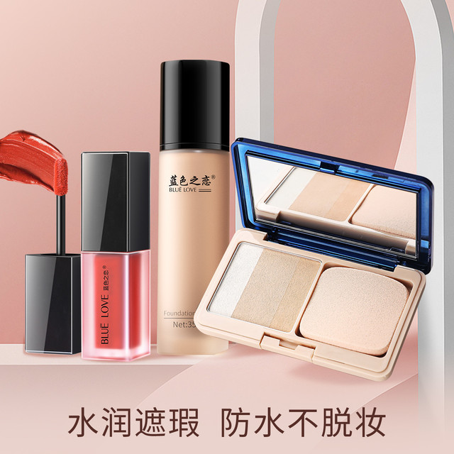 BLUE LOVE 蓝色之恋 底妆3件套装彩妆初学者高保湿粉底液控油定妆蜜粉饼显白唇釉