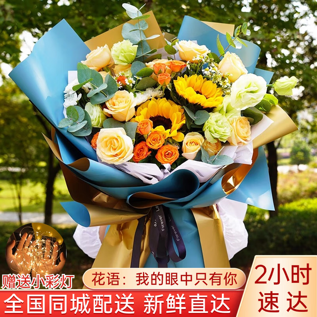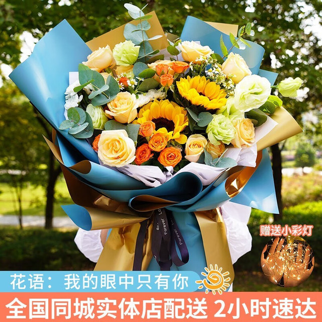 艾斯维娜 鲜花速递向日葵混搭花束生日礼物全国同城配送 向日葵香槟韩式花束135元(需用券)