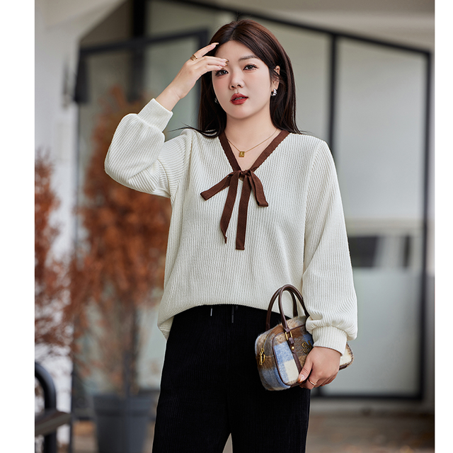 绮娑 显瘦大码胖MM长袖上衣女2023冬季新款减龄蝴蝶结宽松套头毛针织衫