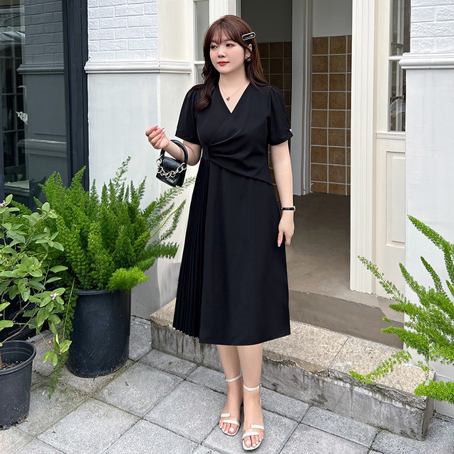 绮娑 大码女装2024夏季新款高级感气质V领小黑裙A字褶皱显瘦胖MM连衣裙