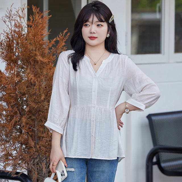 绮娑 大码女装2024秋季新款V领休闲百搭七分袖小衫显瘦收腰胖MM上衣V领