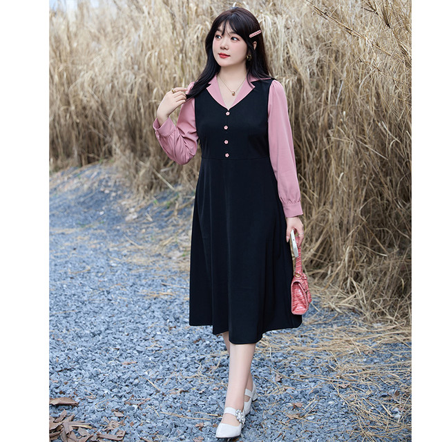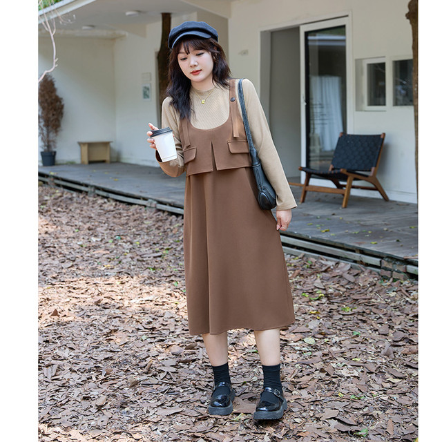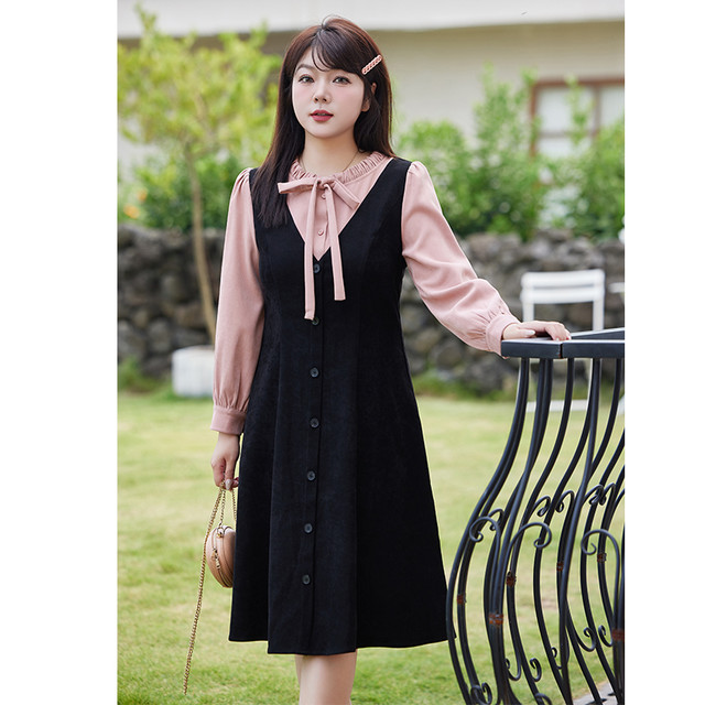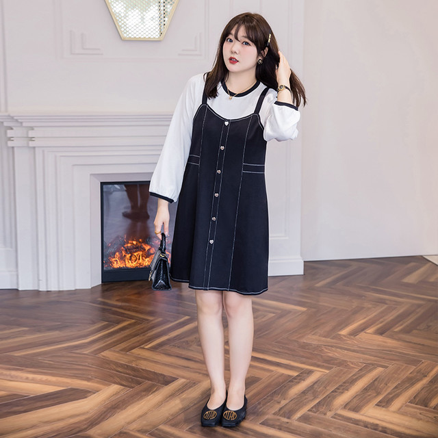 绮娑 大码女装秋装新款宽松显瘦胖mm直筒背带假两件套垂坠感连衣裙长袖