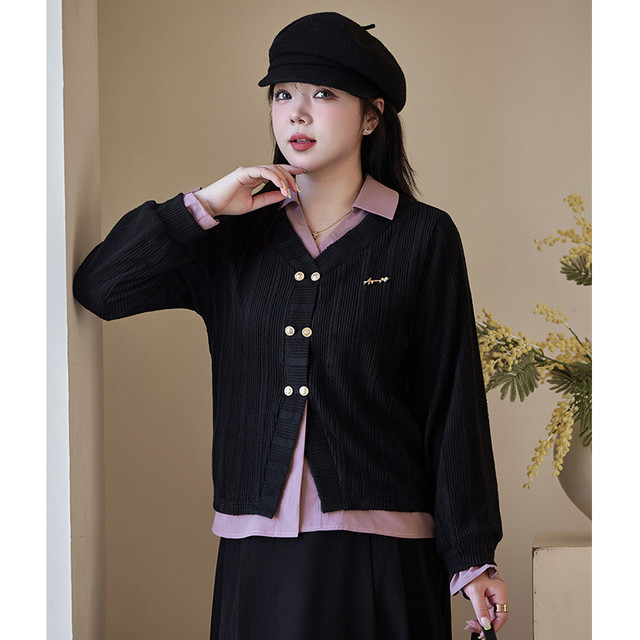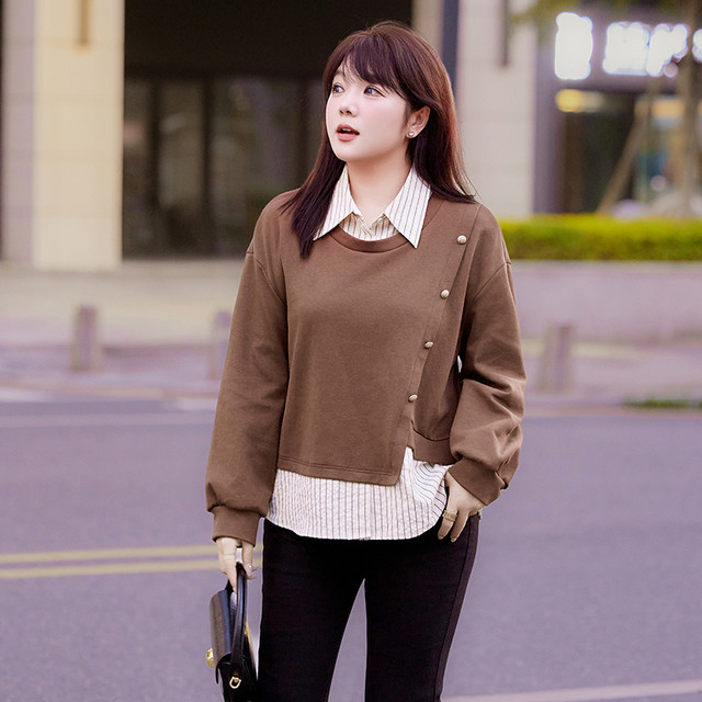 绮娑 显瘦大码胖MM套头长袖上衣女装冬季新款polo领拼接假两件套针织衫