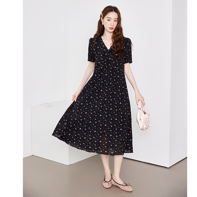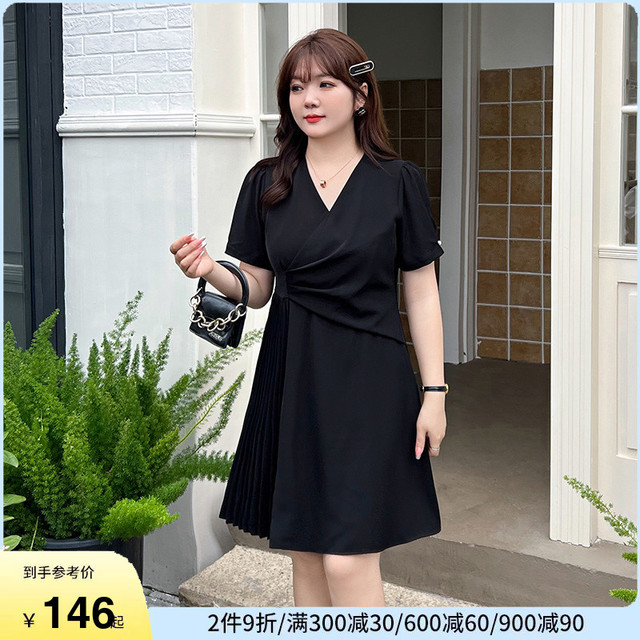 绮娑 大码女装2023夏季新款高级感气质V领小黑裙A字褶皱显瘦胖MM连衣裙