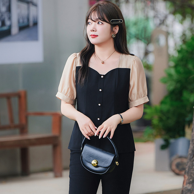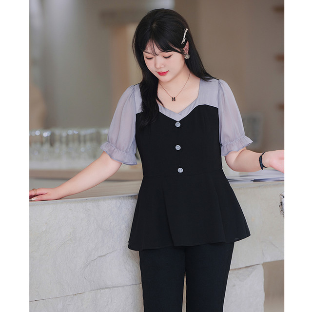 绮娑 大码胖MM上衣女显瘦遮肚子2024年夏装新款V领气质方领收腰雪纺衫